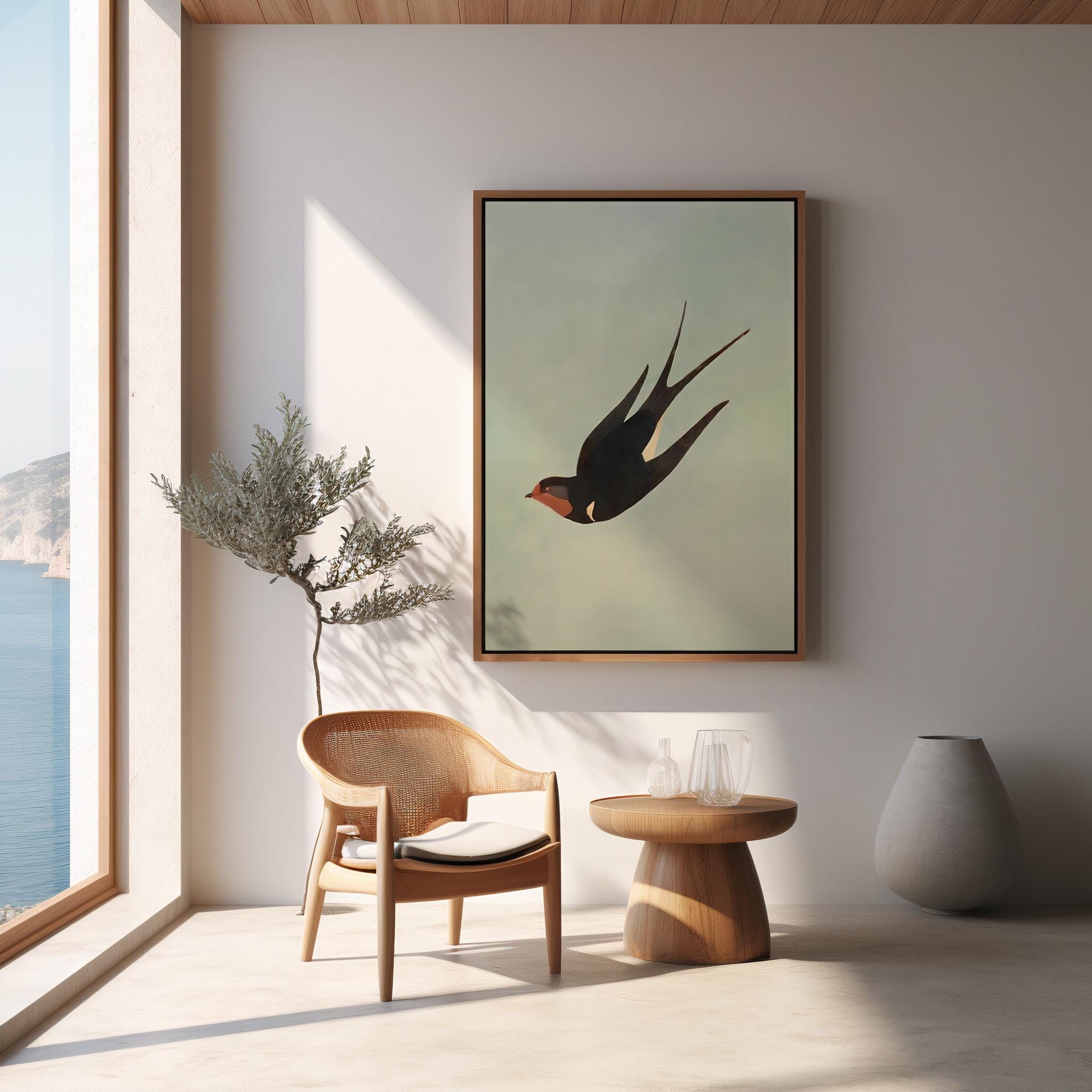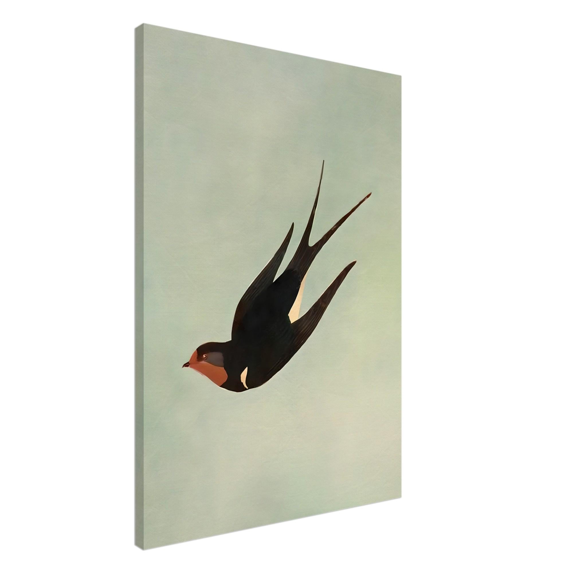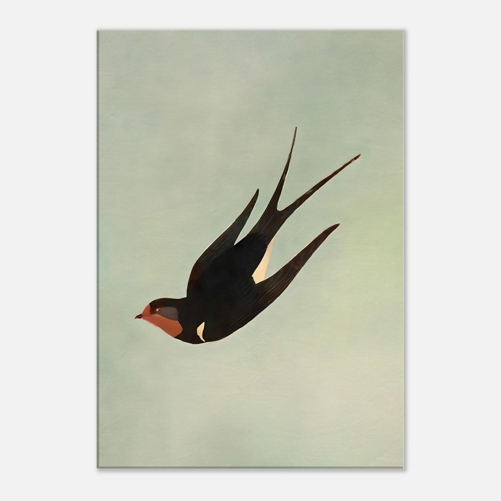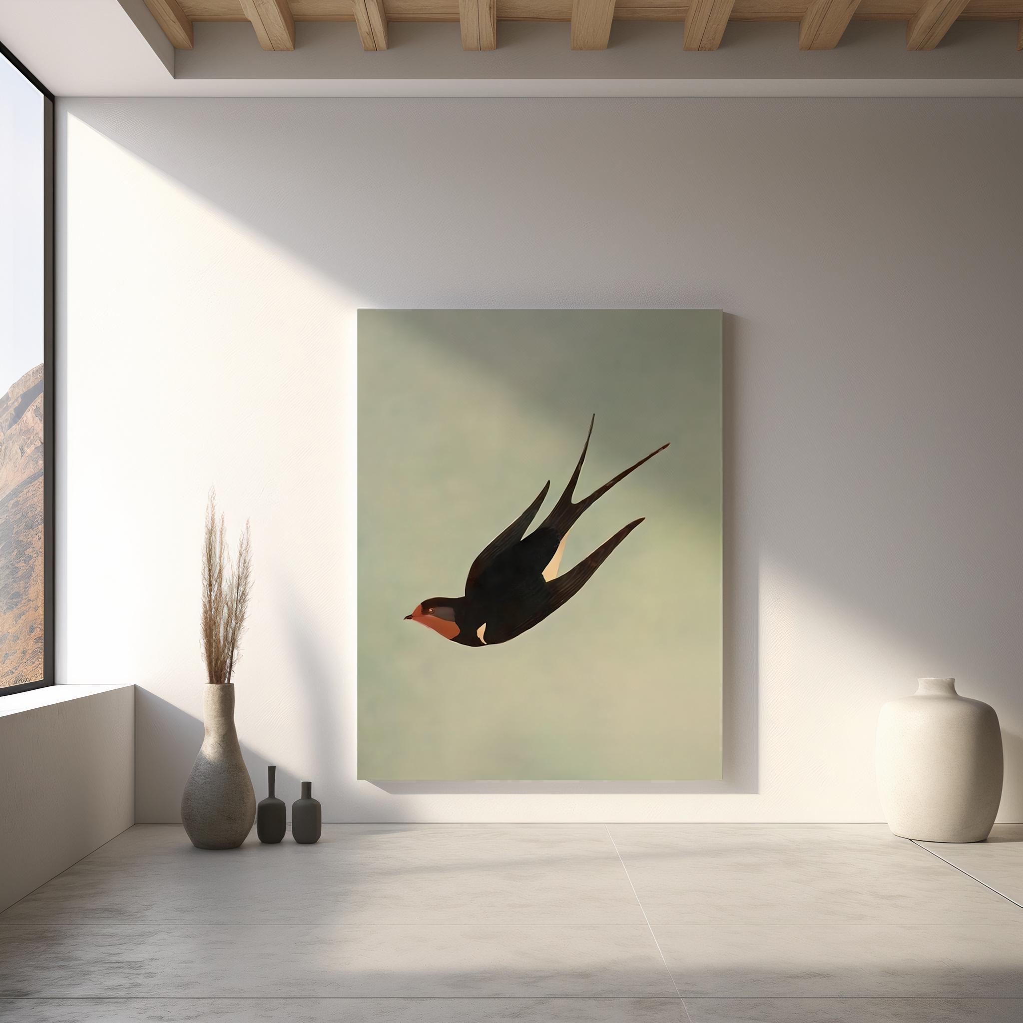 The minimalist composition allows the swallow to stand out as a striking focal point while still maintaining a refined and airy aesthetic. This piece works beautifully in living rooms, bedrooms, offices, or gallery walls where nature-inspired artwork adds warmth and character.
