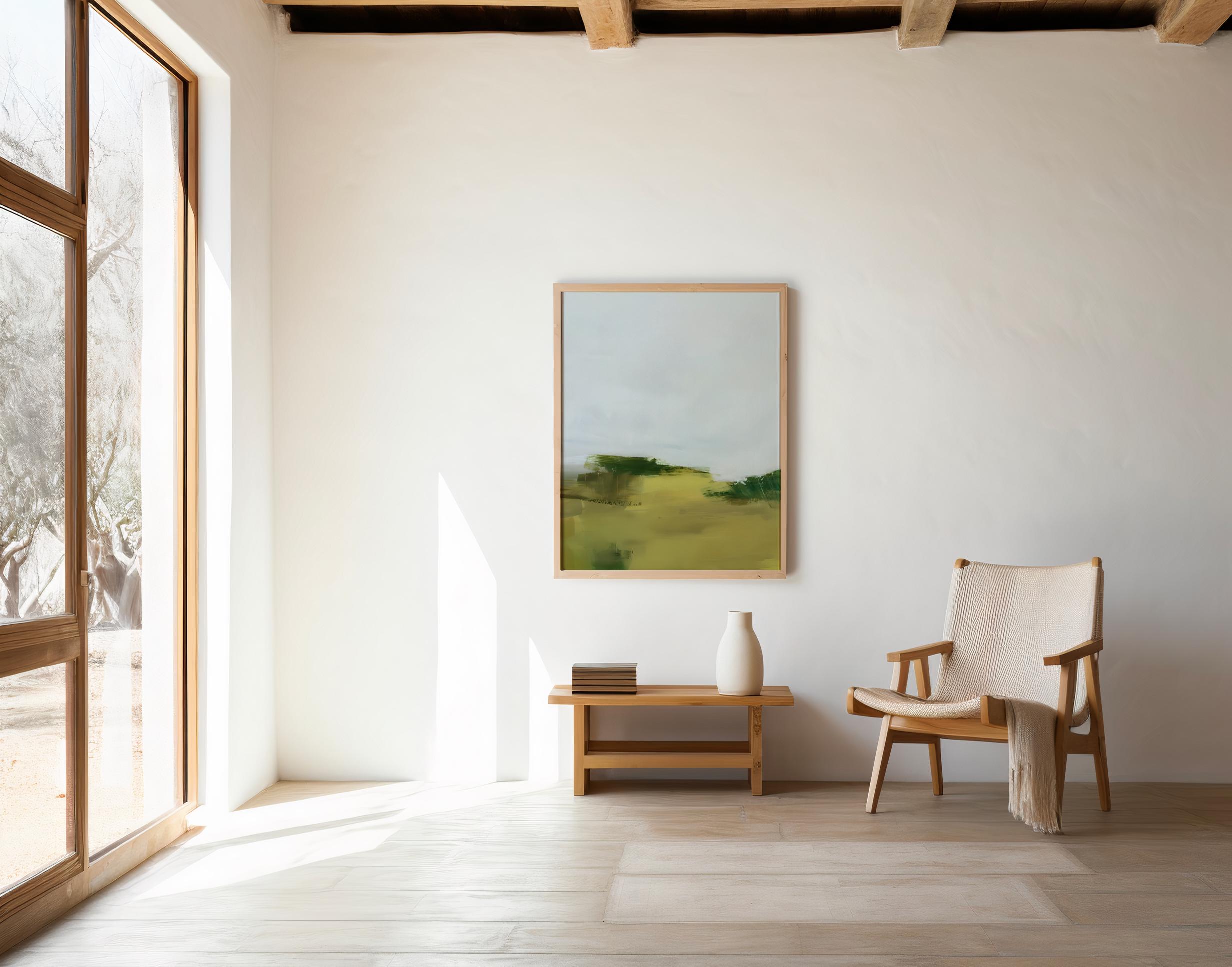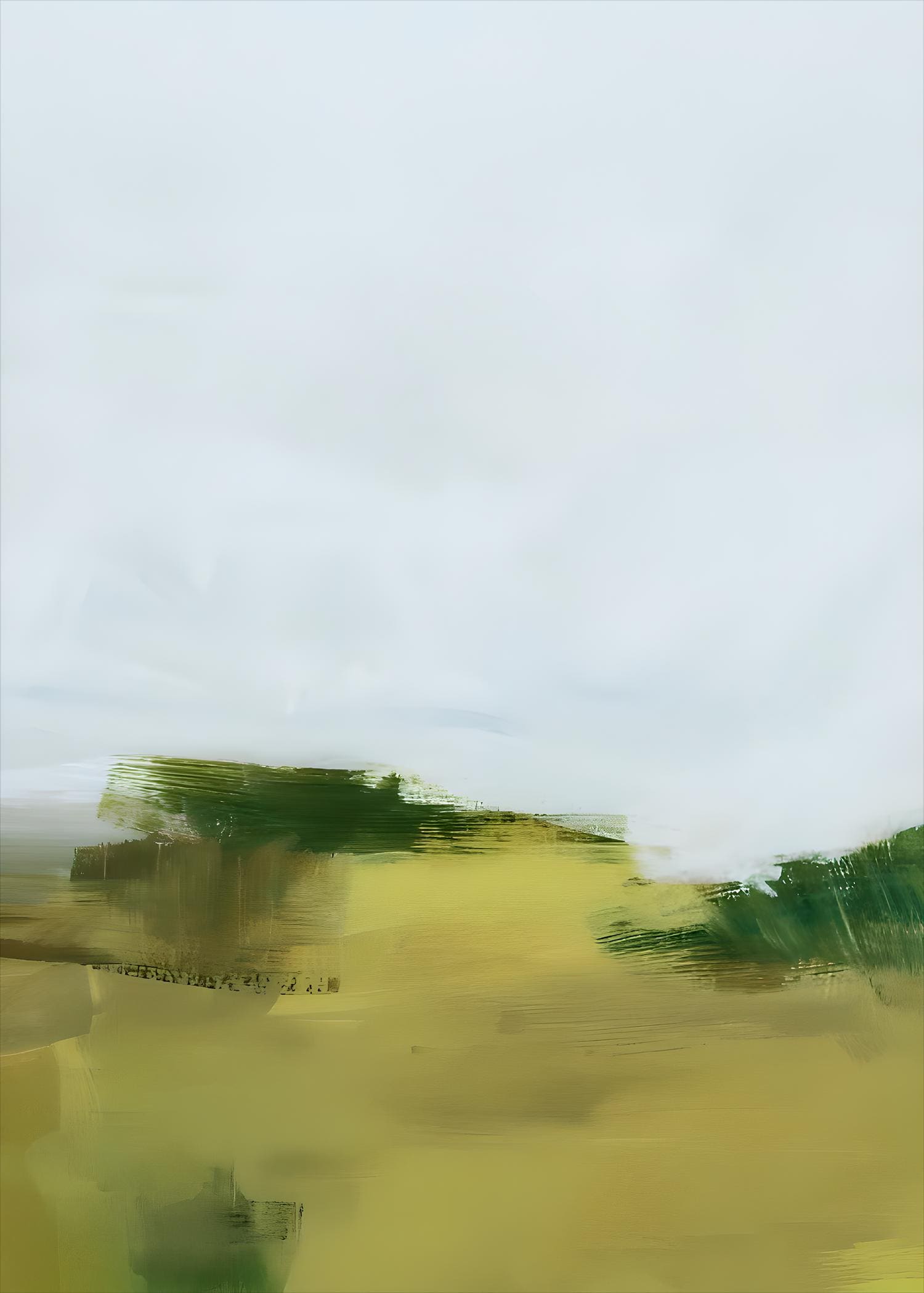 This calming abstract artwork features layered brushstrokes in soft sage green, muted olive, and light sky tones. The painterly composition evokes a peaceful natural landscape while maintaining a clean, minimalist aesthetic.