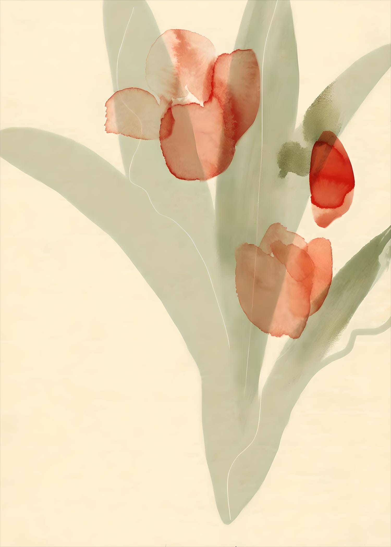 This minimalist floral artwork features soft red tulip forms layered over muted sage green leaves, creating a calm, airy composition with a modern botanical feel. The loose, fluid shapes give it a light and effortless look.