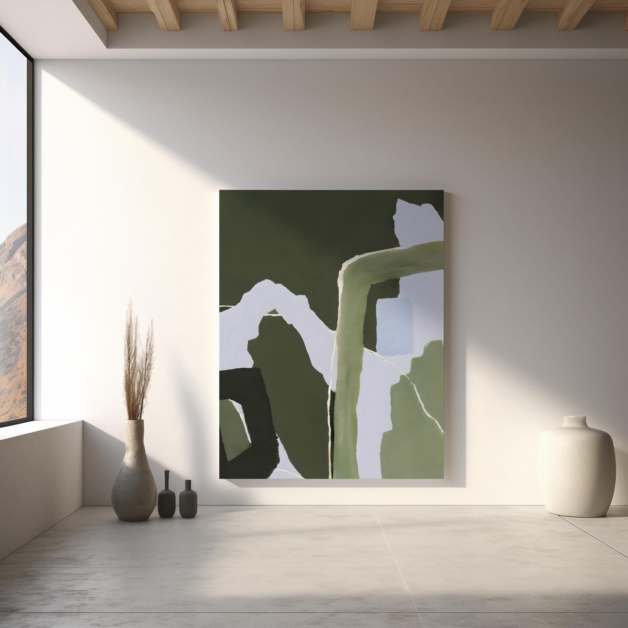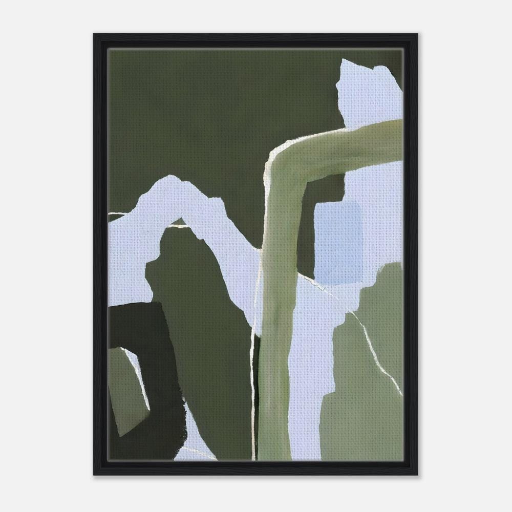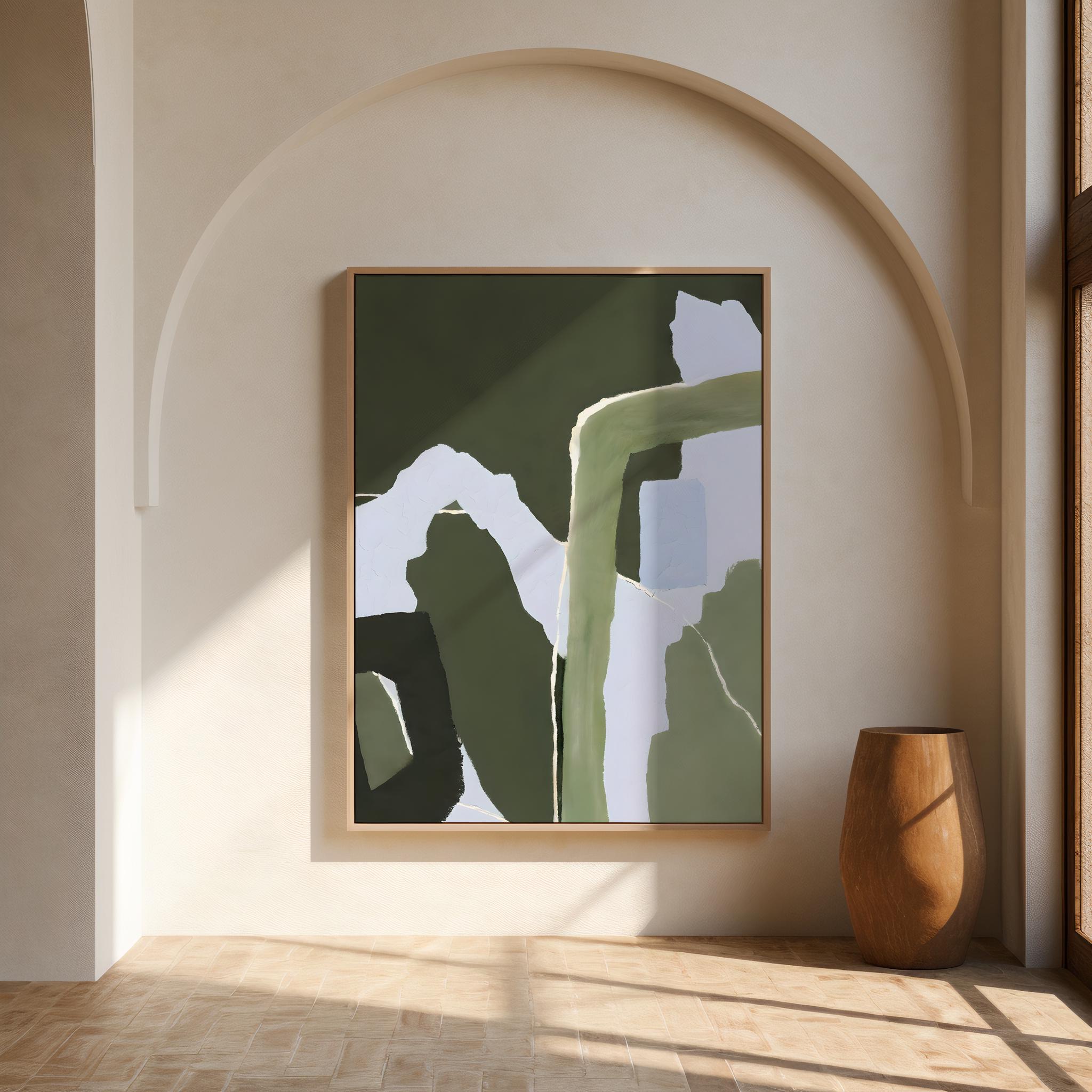 This striking color-block abstract brings a fresh, grounded vitality to any space. The palette of deep olive, sage, and cool periwinkle makes it a natural fit for organic modern, botanical, Japandi, and nature-inspired interiors. A powerful statement piece on its own or a bold anchor for a gallery wall.