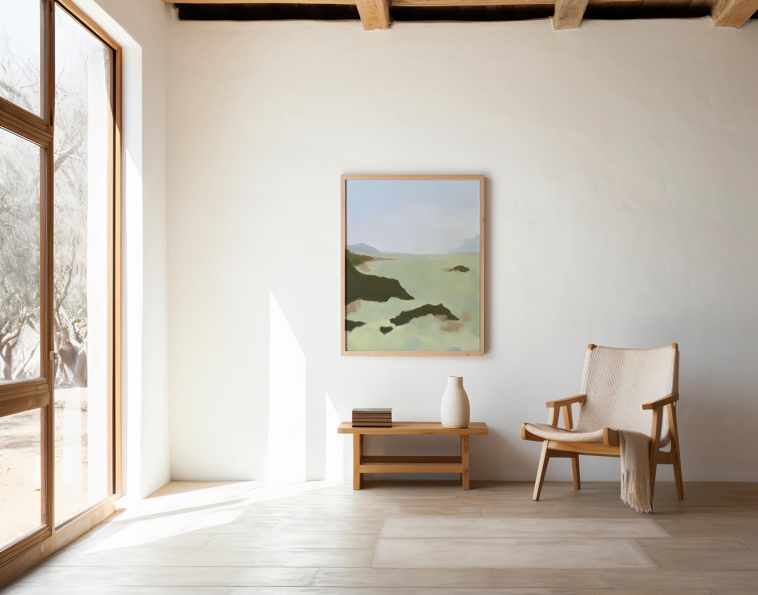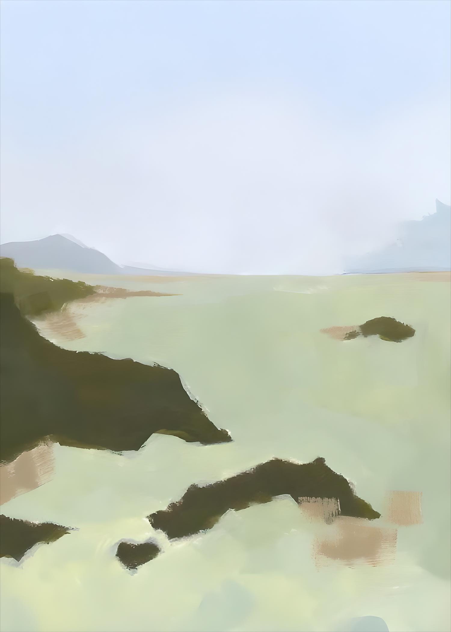 Soft sage green waters stretch toward a pale misty horizon, with dark rocky outcrops and gentle mountain silhouettes fading into a hazy periwinkle sky. The loose, painterly brushwork gives this coastal scene a calm, ethereal quality that works beautifully in Japandi, coastal, organic modern, and nature-inspired interiors.