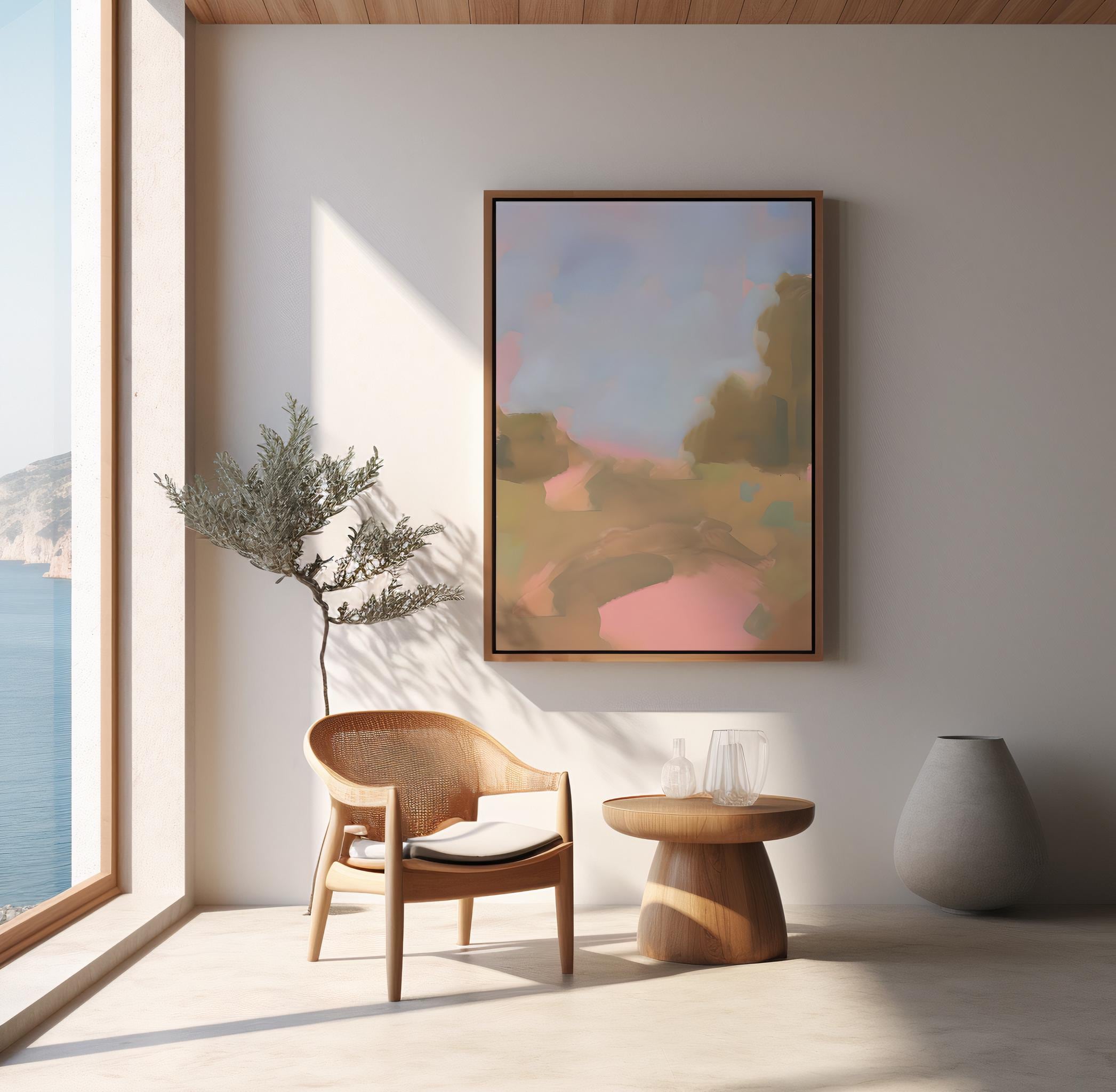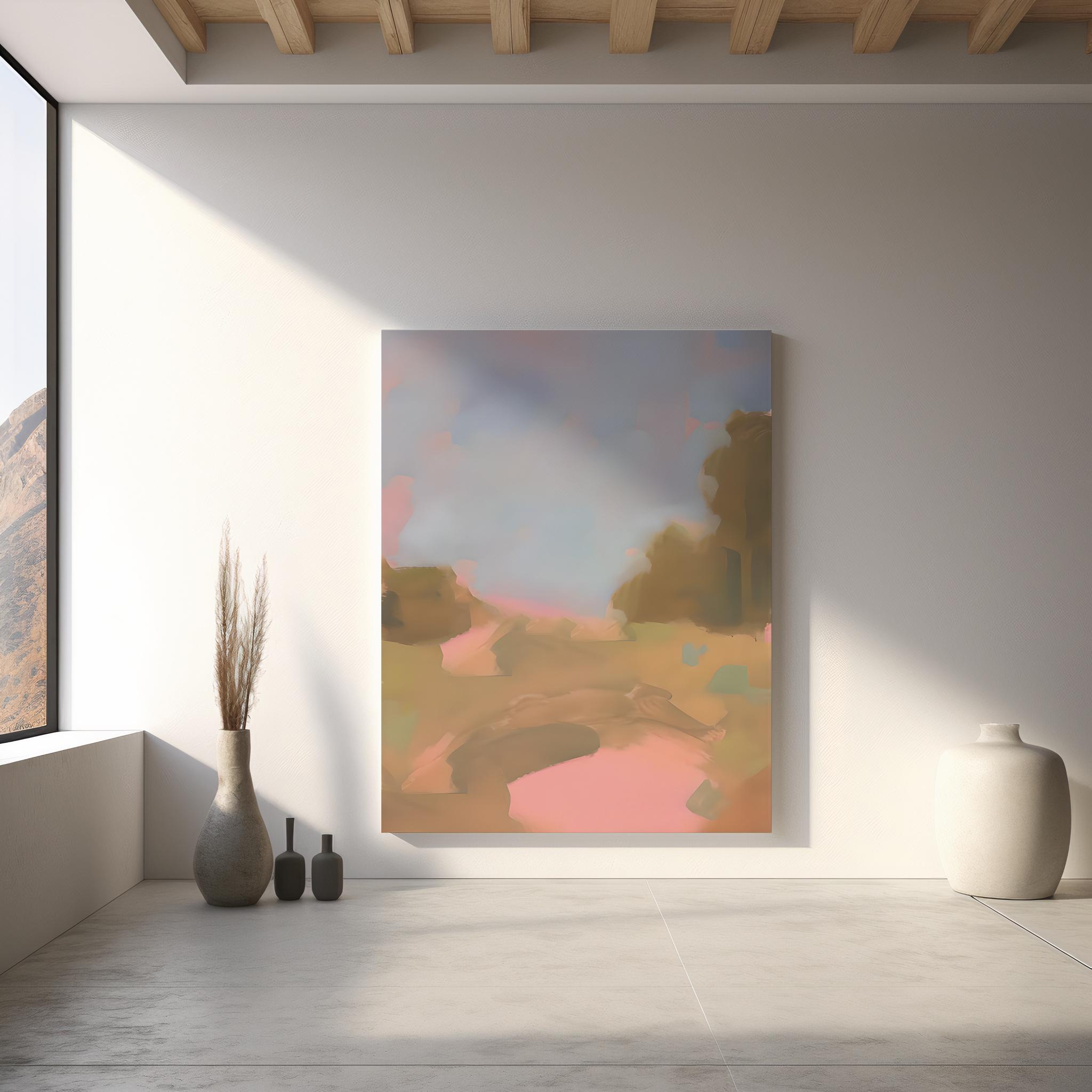 A soft, luminous landscape unfolds in blush pink, powder blue, and warm olive — a figure rests peacefully in the foreground, merging with the earth beneath a glowing pastel sky. The loose, impressionistic brushwork gives this piece a poetic, dreamlike quality that works beautifully in romantic, boho, soft feminine, and organic modern interiors.