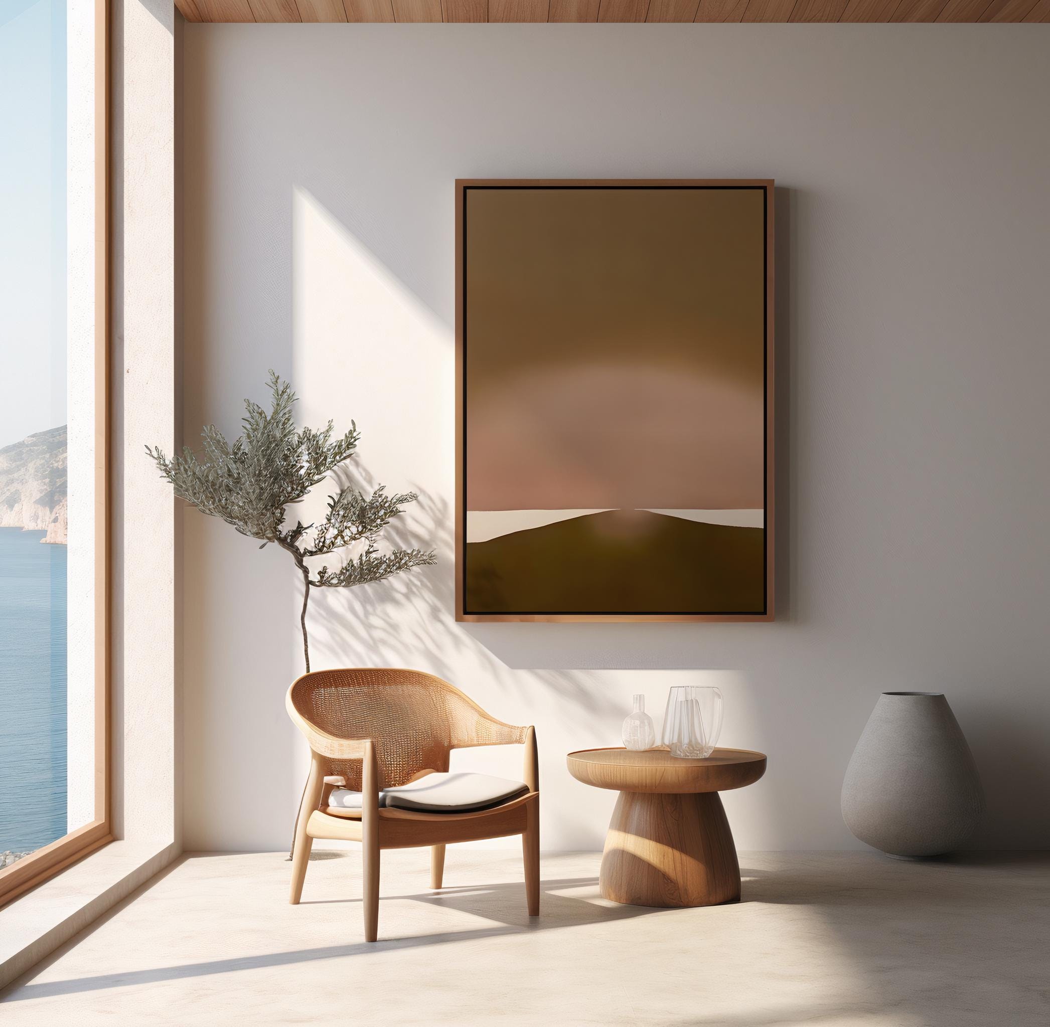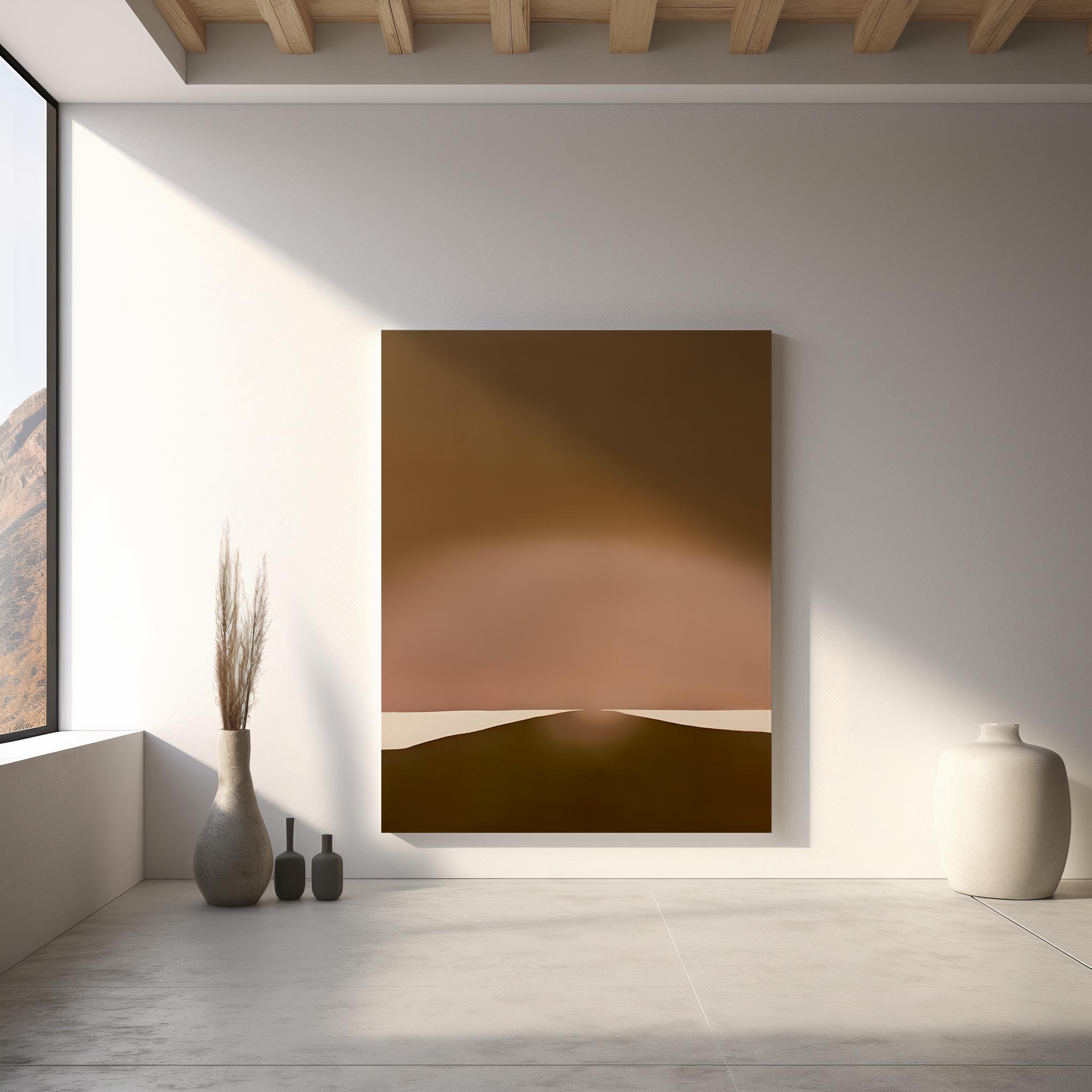 Deep chocolate brown melts into warm blush through a seamless gradient, divided by a single clean cream line in a strikingly simple composition. The smooth, atmospheric tones make this piece a perfect fit for contemporary, Japandi, organic modern, and masculine minimalist interiors.