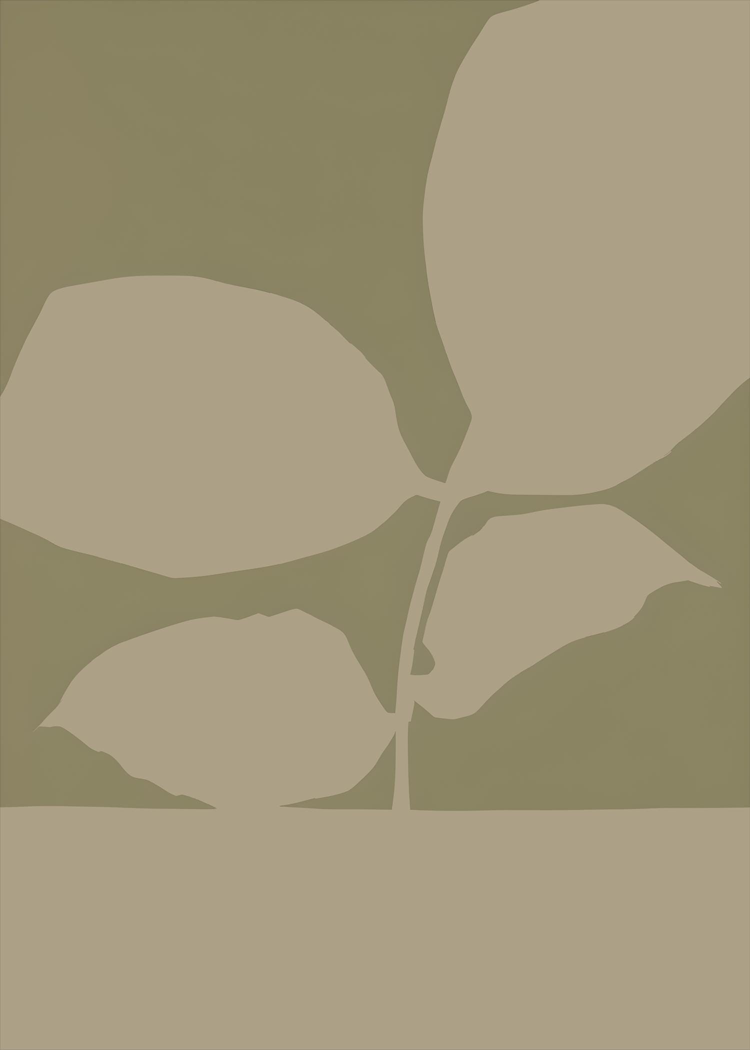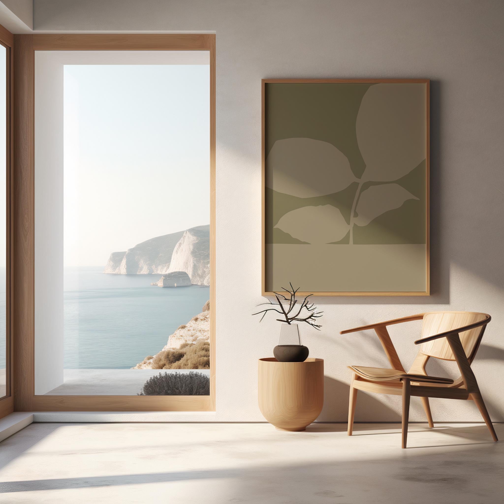 Bold botanical leaves rendered in soft sage against a deep olive background — minimal, graphic and quietly elegant. The tonal green palette and clean silhouette composition make this piece a perfect fit for Japandi, organic modern, Scandinavian, and nature-inspired interiors.