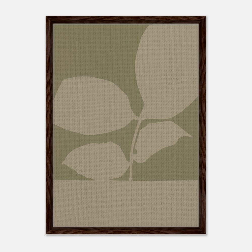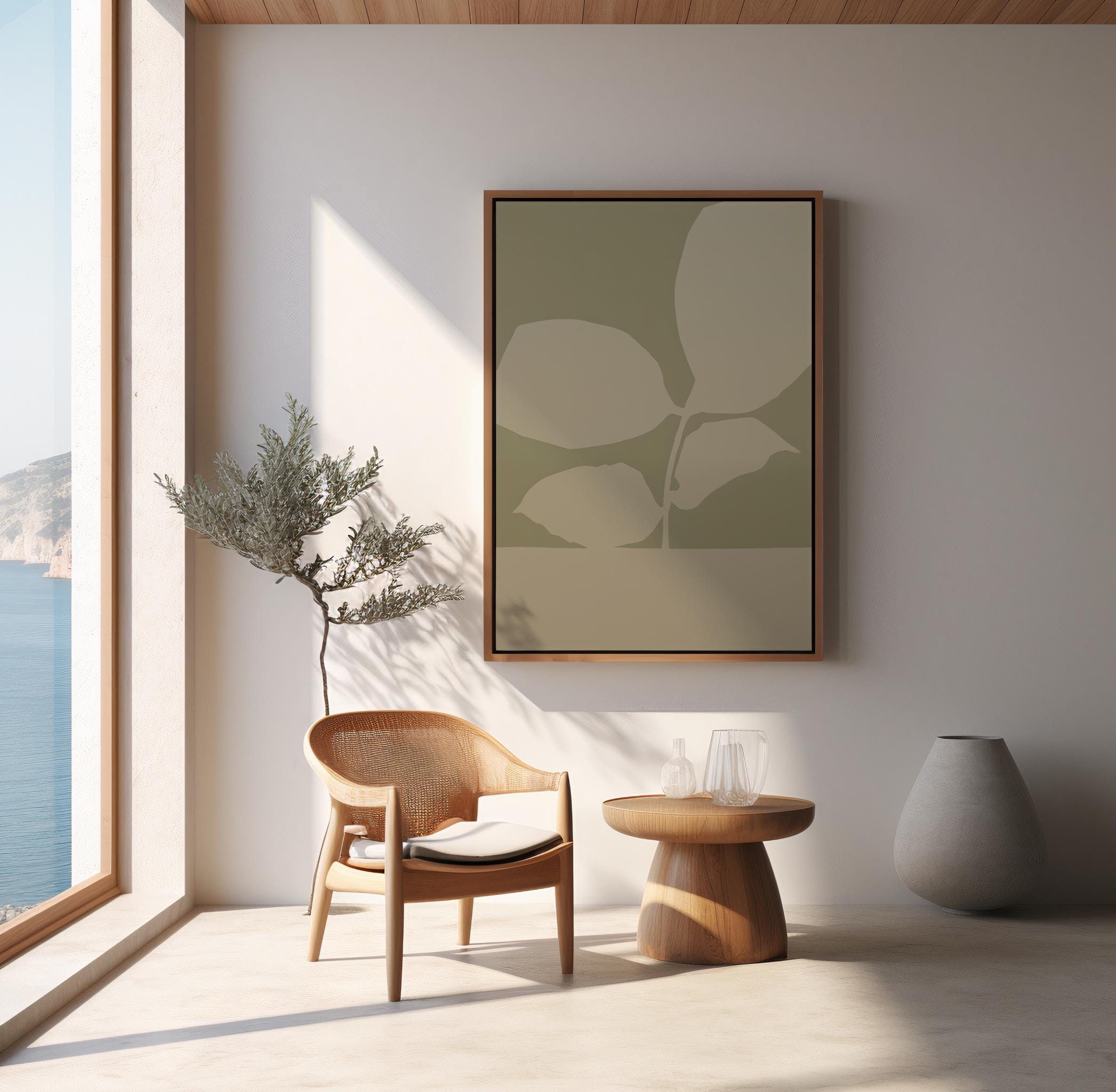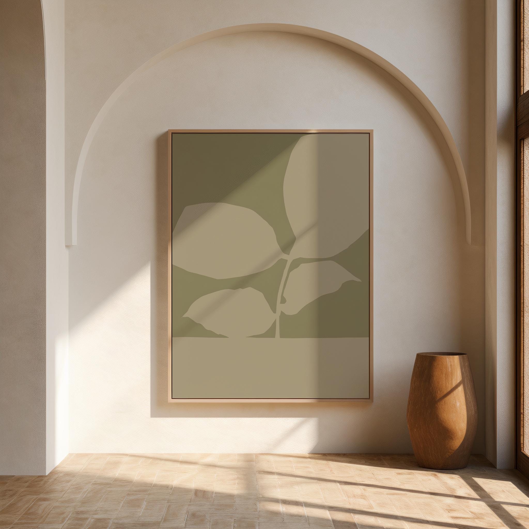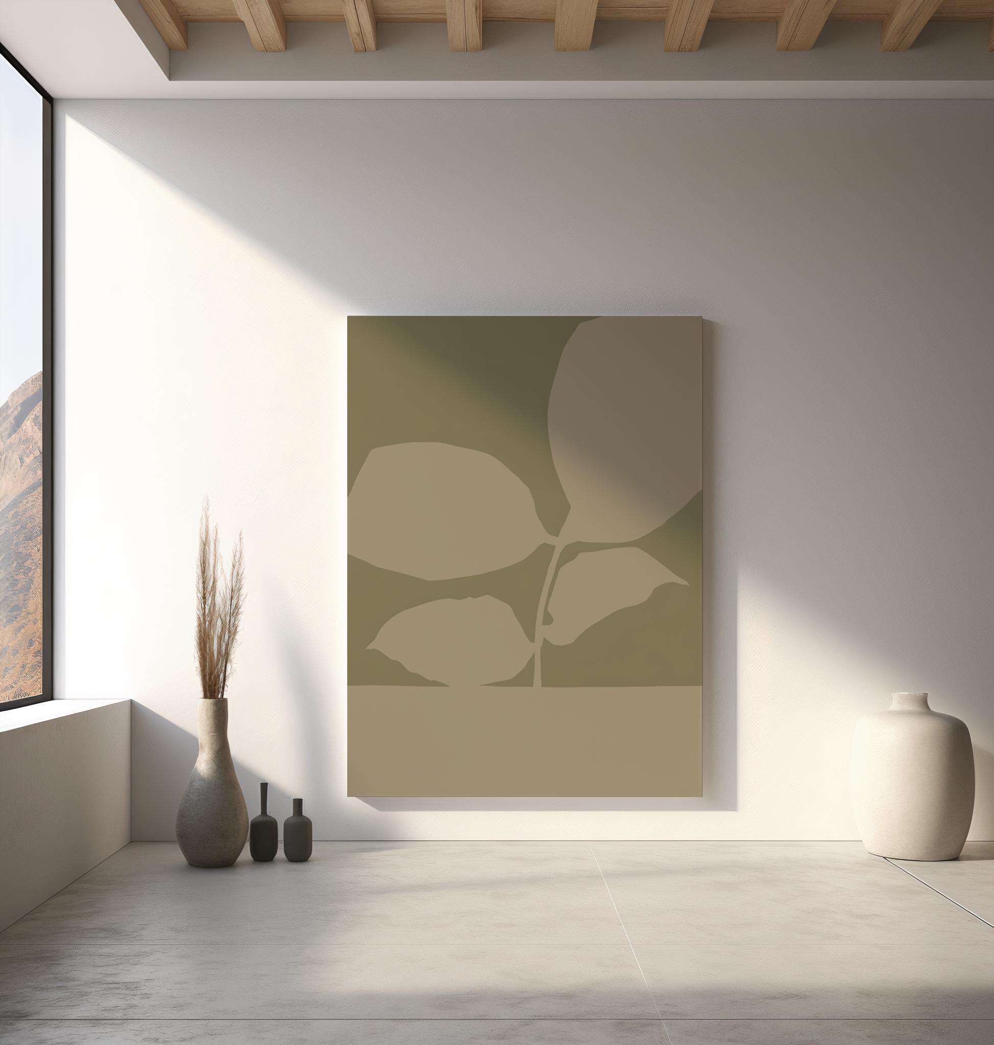 Bold botanical leaves rendered in soft sage against a deep olive background — minimal, graphic and quietly elegant. The tonal green palette and clean silhouette composition make this piece a perfect fit for Japandi, organic modern, Scandinavian, and nature-inspired interiors.
