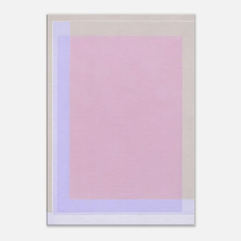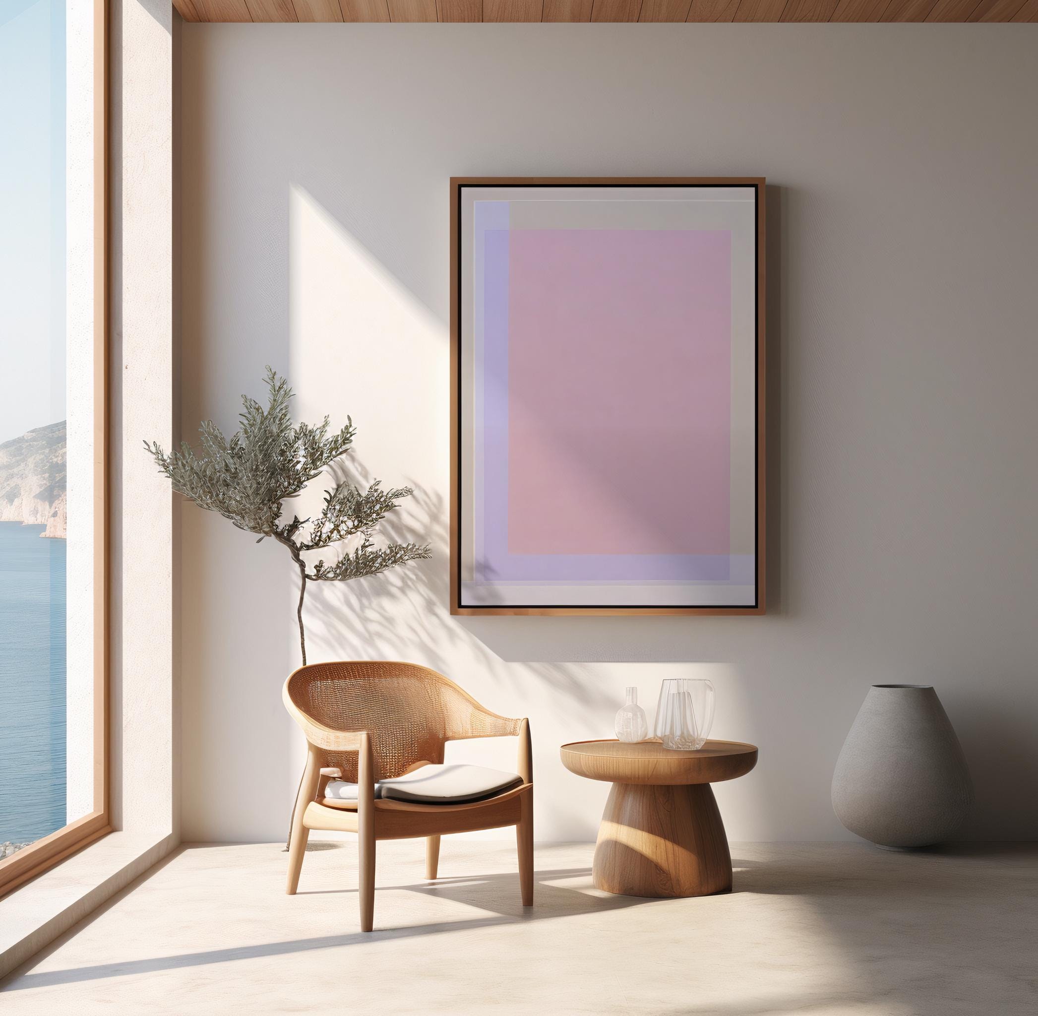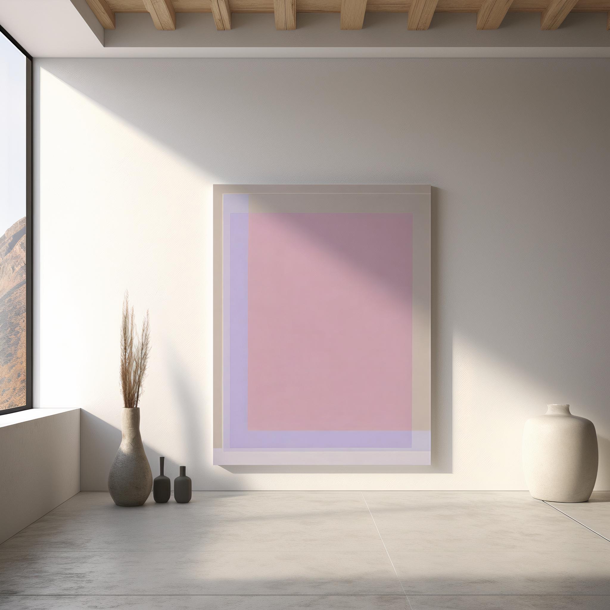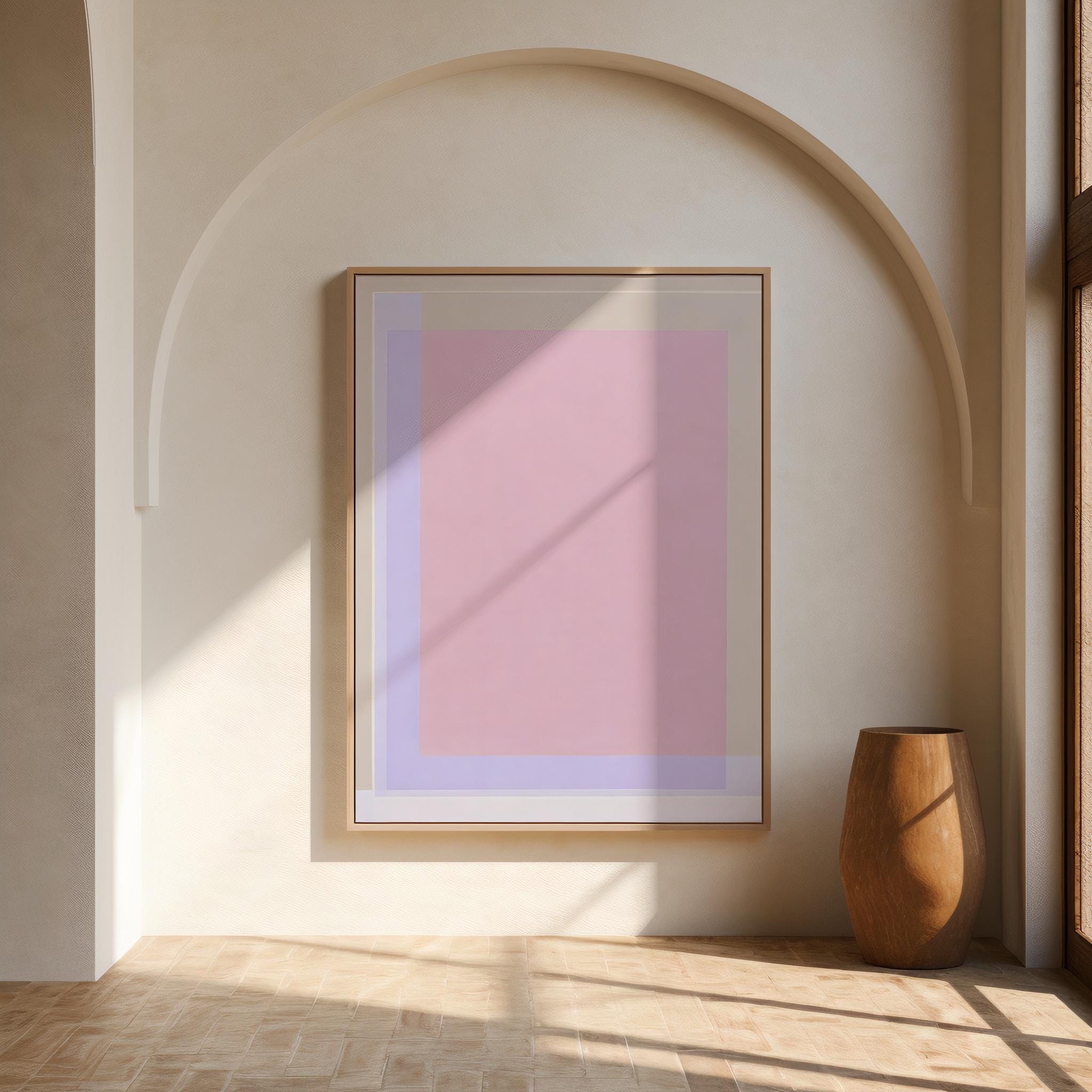 Soft blush pink and periwinkle blue layer over a warm greige background in a clean, quietly sophisticated color block composition. The gentle overlap of pastel tones and precise geometry make this piece a natural fit for Japandi, Scandinavian, soft feminine, and contemporary minimalist interiors.